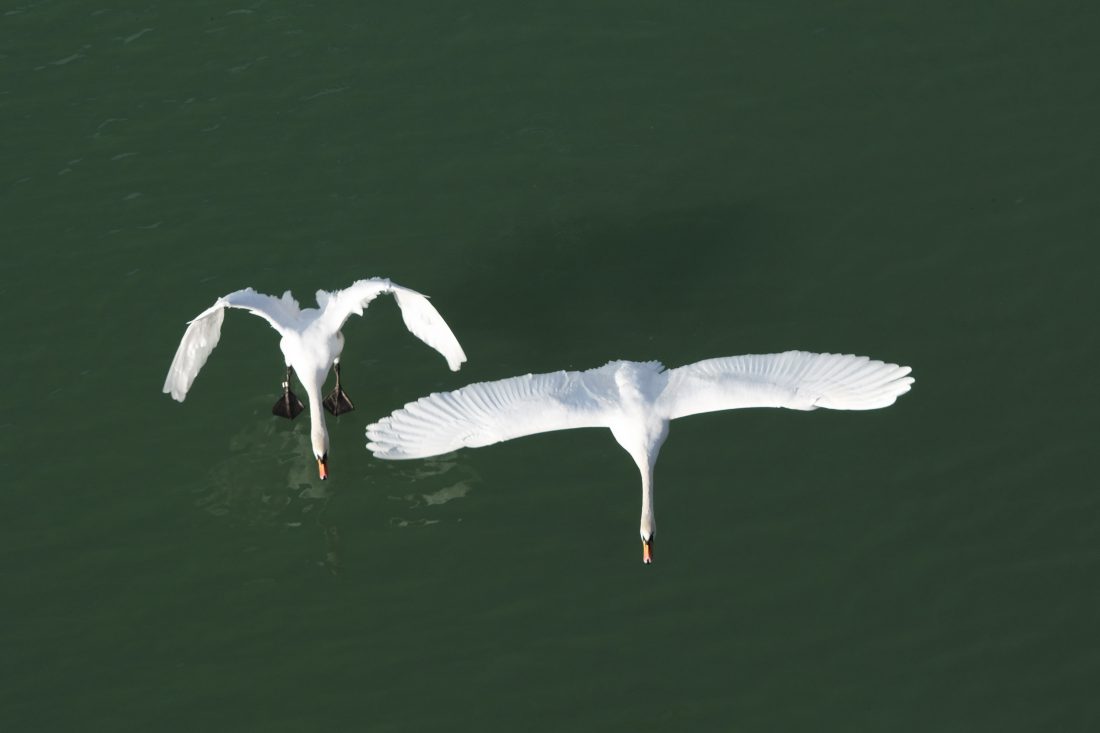 Description: Enkraten pogled iz mostu na elegantne ptice v preletu.